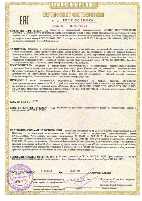 Котел водяного отопления "Сибирь КВО" 20 функционирует на твердом топливе: дрова, прессованные брикеты, уголь и способен справиться с отоплением дома площадью до 200 м2, оборудованного системой водяного отопления с естественной или принудительной циркуляцией. Рабочее давление, предусмотренное для оптимального функционирования котла "Сибирь КВО" 20 кВт составляет не более 1 Бар.